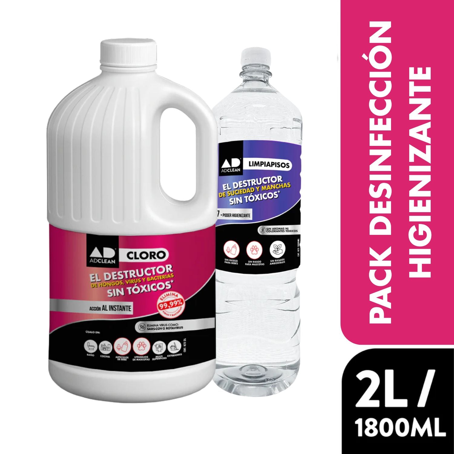 El Pack Desinfección Higienizante fue creado para mantener tu hogar limpio, desinfectado y seguro desde el primer día. Combina el poder del Cloro 2 L para una desinfección efectiva con el alto rendimiento del Higienizante de Pisos 1,8 L, ideal para la limpieza diaria sin enjuague y sin tóxicos.